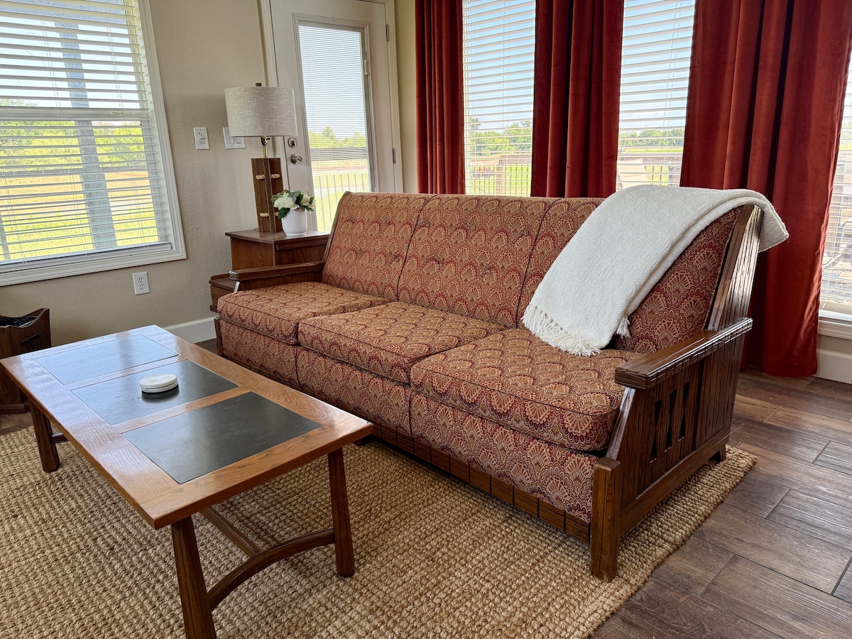 Enjoy your stay in Stephenville at our peaceful and stylish studio apartment. Located on our property, you'll have access to our private backyard and all of its amenities including a workout space, koi pond, fireplace and grill. This newly built space (April 2023) is furnished with brand new appliances, a full kitchen, refurbished wood floors and high ceilings. Within walking distance of Tarleton State University, it is ideal for parents or alumni. We look forward to your stay!