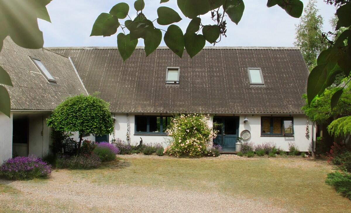 Nyd hygge og ro i ca, 50 m2 lys og lækker lejlighed under loftet i nedlagt kostald. 1 af i alt 2 lejligheder. Bygget i 2021. 2 soveværelser, stue med sovesofa, fuldt køkken, samt eget bad. Adgang til fælles pool. Ren idyl på landet, men med kun 2.5 km til gode indkøbsmuligheder, samt ca. 10 min i bil til fantastisk børnevenlig sandstrand. Hunde, katte og heste. Ejer bor på grunden, men i anden længe. Fibernet og tv-pakke. NYT 2025: Gameroom med bordfoldbold, bordtennis og retro spillekonsol.