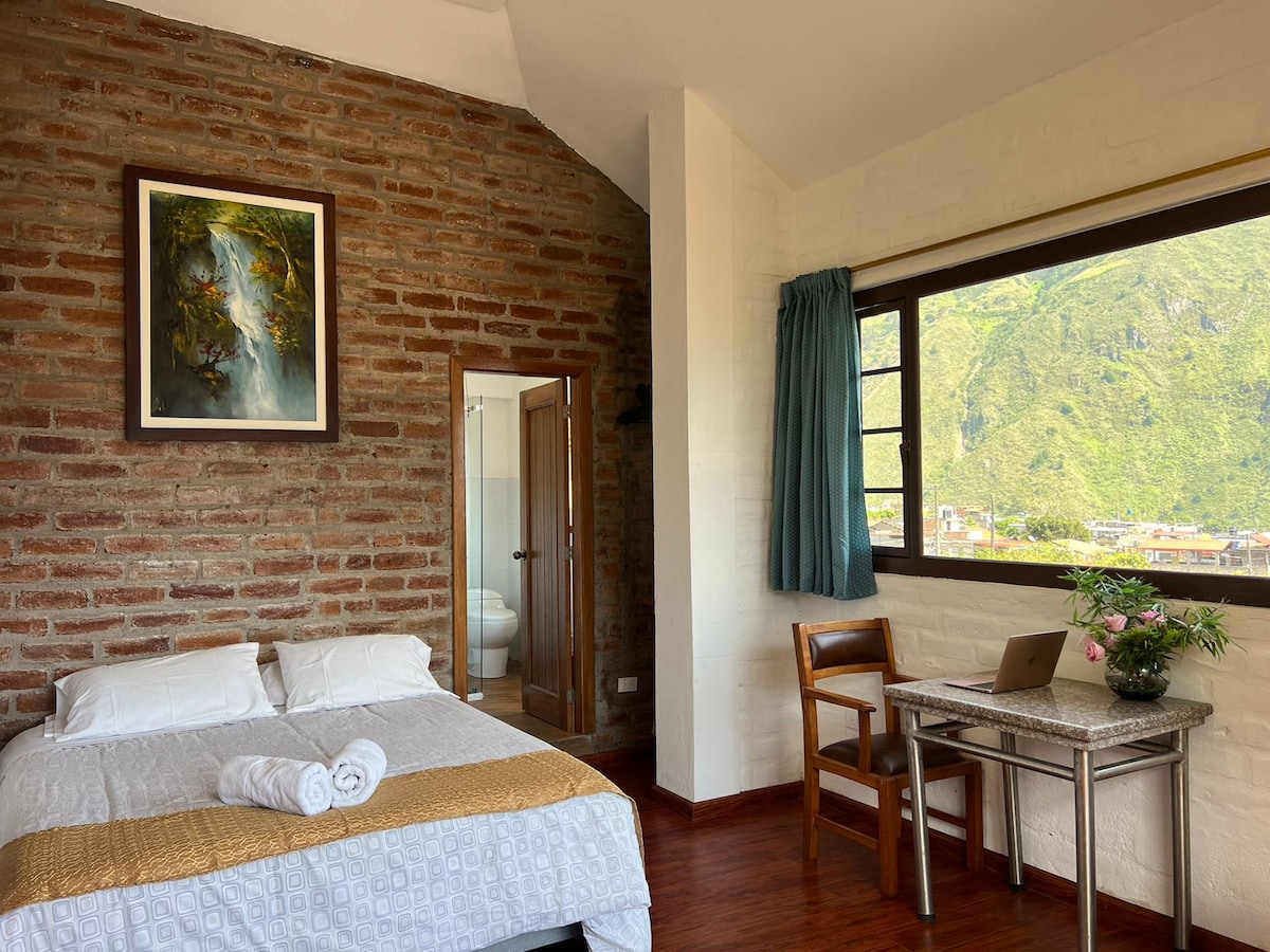 Relájate en nuestra acogedora habitación matrimonial en el corazón de Baños. Disfruta de una vista espectacular a las montañas, a pasos de las aguas termales y la vibrante vida nocturna. ¡Perfecto para parejas aventureras! Habitación privada y cómoda en el centro de Baños. Ideal para descansar después de explorar cascadas y volcanes. ¡Wifi gratis, parqueadero y desayuno incluido!