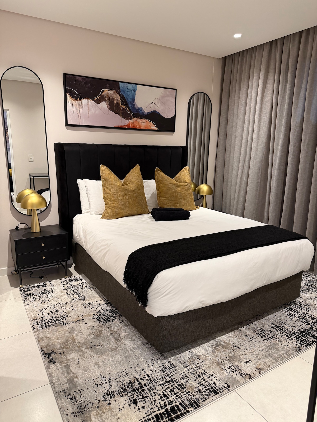 15 Min from OR Tambo. This chic black-and-white space, in a secure gated complex, offers a perfect blend of comfort and convenience. Enjoy a dedicated parking spot, lock-and-go lifestyle, and remote gate access. With a luxurious queen bed and double bed, office space, and high-speed Wi-Fi, it’s ideal for work or relaxation. The fully equipped kitchen includes a gas hob and dishwasher. Relax on the cozy balcony and enjoy premium furniture, bedding, and dining essentials.