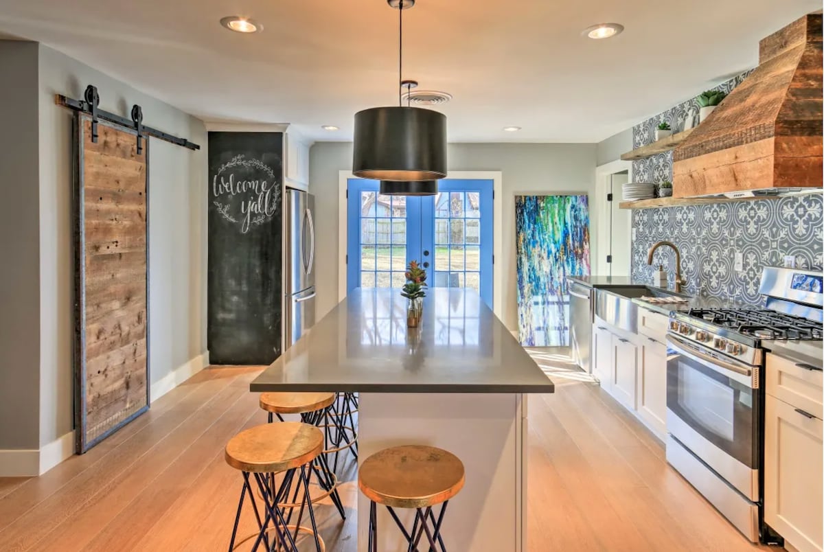 Relax beneath a grove of pecan trees in this peaceful hideaway near I-20 and I-35. Drive 15 minutes to downtown or west 7th, 10 minutes to Magnolia Ave, and 20 minutes to the Stockyards. Professionally designed and renovated, the home includes a large, fully stocked kitchen with a reverse osmosis-filtered water tap and complimentary tea and coffee bar. End your day with a campfire and s'mores under the string lights and flowering vines in the backyard.