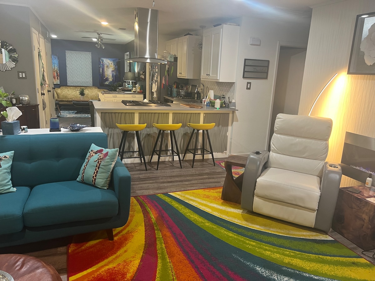 An Eclectic Delight! This open concept home features an ultra contemporary design to mid-century modern fun to a retro rage! Relax in the spa-like atmosphere where you can unwind in the King size adjustable massage bed or gather 'round the piano & belt out a few show tunes!! How 'bout a flash-back playing the ArcadeClassic, Space Invaders!? Full body massage chair! Love the outdoors? BarBQ around the fire pit! Watch the sunset on the front porch swing! Snooze in twin hammocks. A DREAM!💕