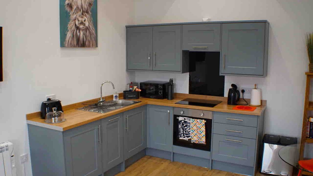 The studio is located just off the high street with bars and restaurants a few mins walk away. However it is secluded and quiet. 30 degree heating available should it be required! !There is parking outside the front door overnight, outdoor seating area. Fully equipped kitchen, washer drier, 48 in TV Sky Q with movies and sky sports, Netflix and Disney plus, coffee machine, DVD player. All bedding and towels provided along with tea coffee, sugar and condiments, cooking oil, washing liquids etc