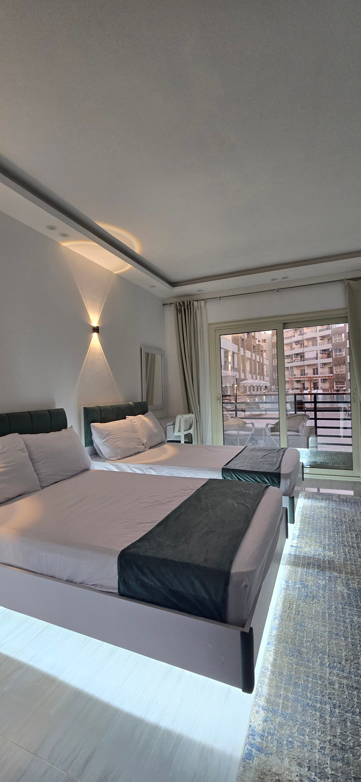Enjoy with the whole family in this elegant residence, which consists of two bedrooms and a reception with a wonderful view of the sea and a swimming pool, where you can see the sea sleeping on the very comfortable bed or the sofa in the reception, calm with the beauty of the view is an important thing that makes you enjoy your time, and you can also relax on the balcony of the apartment where healthy sunlight is emitted from sunrise to sunset, and you can also relax on the pool on the ground fl
