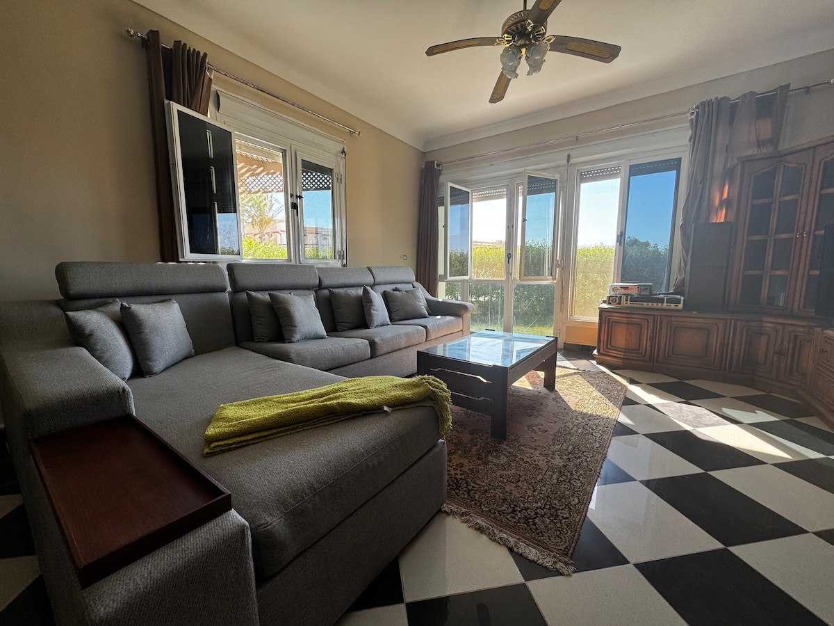 My apartment is cozy with simple and comfortable style. It's located on the ground floor with a garden view with direct view of the swimming pool, which is very relaxing. It's a great place to hang out and change your surroundings. Also there is security in everystreet of the resort ,and 2 main restaurant in front of the sea And 3 huge supermarket inside the resort you donot need to go out !! And for sure its has a private beach with a private golf car Its 5 mins away from hamam city♥️