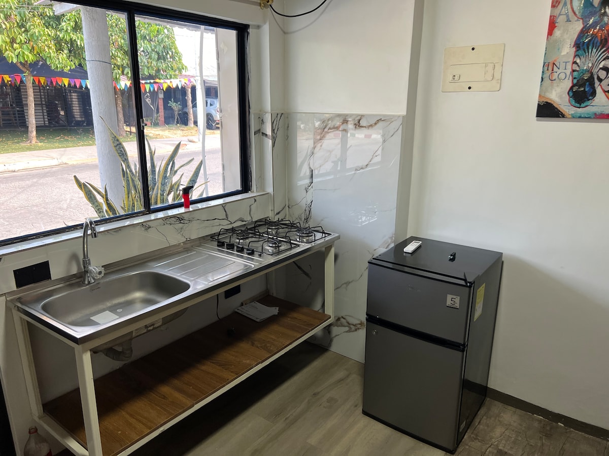 apartaestudio tipo loft, completamente adecuado, ideal para una persona o pareja que busque comodidad, privacidad y un espacio moderno. El inmueble cuenta con un diseño tipo loft bien distribuido, con división elegante en madera que separa el área de descanso, brindando mayor privacidad. Dispone de cama amplia, aire acondicionado, Smart TV y excelente iluminación. Incluye cocina equipada con estufa, lavaplatos y nevera, perfecta para preparar tus alimentos, además de lavadora