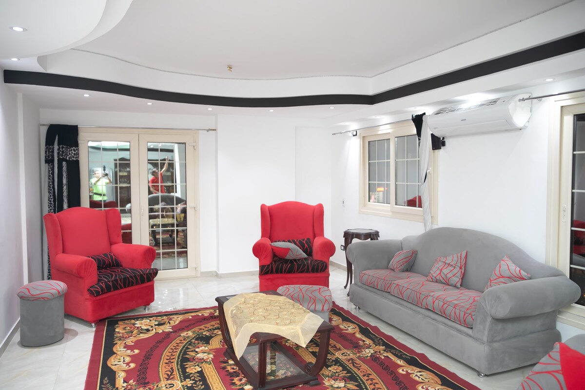 Relax with the whole family at this peaceful and private compound where will you be close to the High way (Cairo ring road) to get benefit of fast transportation to Cairo airport in 30 minutes and Cairo downtown in 30 minutes also You will also enjoying the Moqatem Mountain View which is a nice view to relax