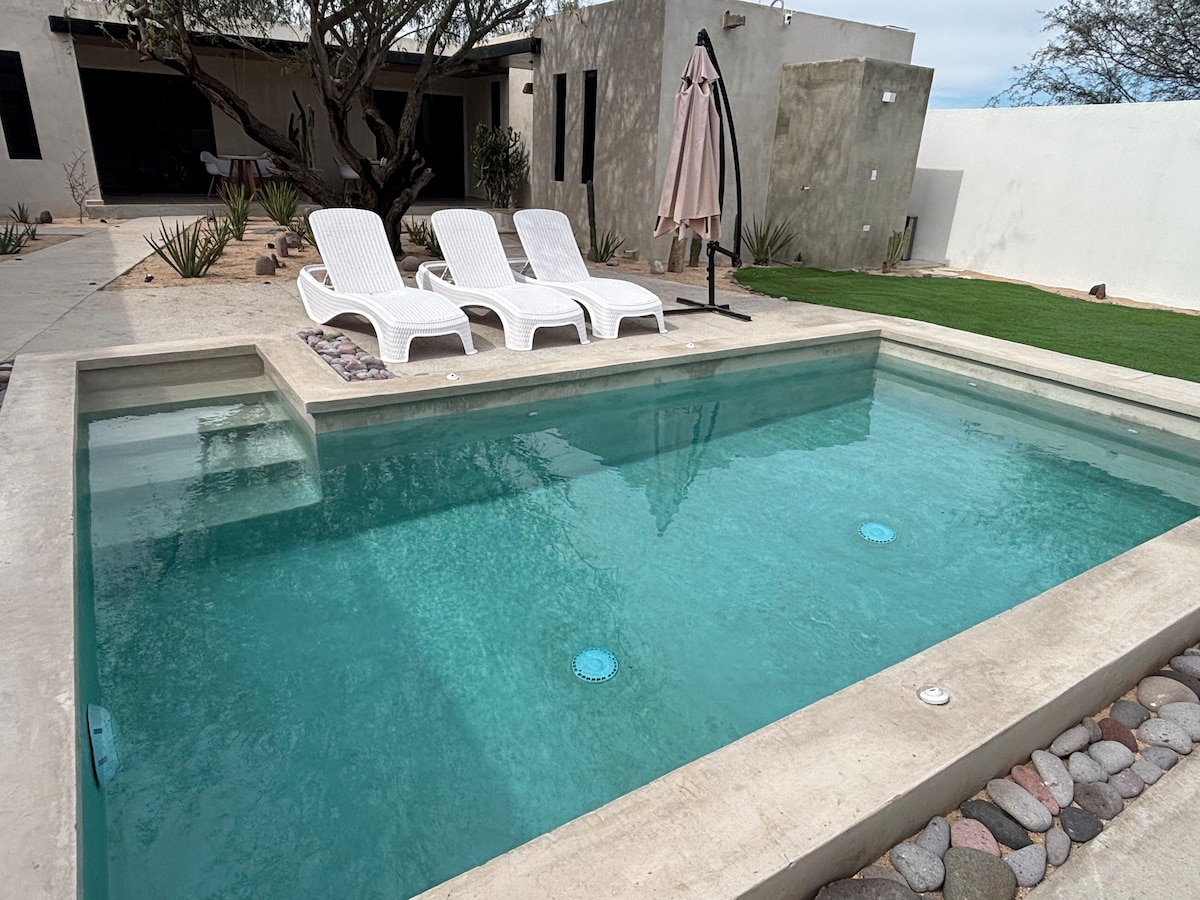 Relax in this new and modern house in El Centenario, a quiet and safe area of La Paz. Accommodates up to 5 people, with 2 bedrooms, 2 bathrooms, equipped kitchen, living room, dining room and air conditioning. Enjoy the backyard with a private pool, Starlink internet, Netflix, Prime TV, and parking. Ideal for relaxing with family or friends.