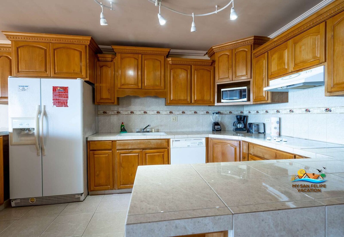 Stay in the "MOST RENTED" and updated house. Our place is walking distance to the best Beach in San Felipe. Big balcony with a beautiful Ocean view. BBQ Grill. Open concept, big Master bedroom with private bathroom. A/C unit and ceiling fan in bedroom and Living room. Nice Mattress Sleep up to 12 people. 2 CAR GARAGE. Washer and dryer inside unit. Cable TV. "FREE HIGH SPEED Internet". Very Clean. We provide Bed Sheet, Towels, Beach Chairs, Toys RENT BY OWNER "NO AGENCY" Pet Control Certificate