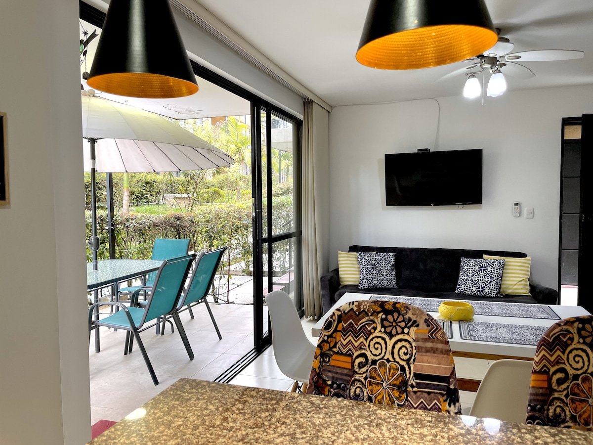 Sensational and elegant apartment-hotel surrounded by nature; fully equipped for a pleasant stay. You can enjoy a new, impeccable place with a fresh and cozy design; 24-hour surveillance. 5 minutes from the airport and 20 minutes from Parque del Café. Resort-style amenities: 3 pools, slide, children's games, jacuzzi, BBQ, washing machine. Strategically located to get to know the entire coffee region and cities such as Pereira (1h30m) and Cali (2h30m).