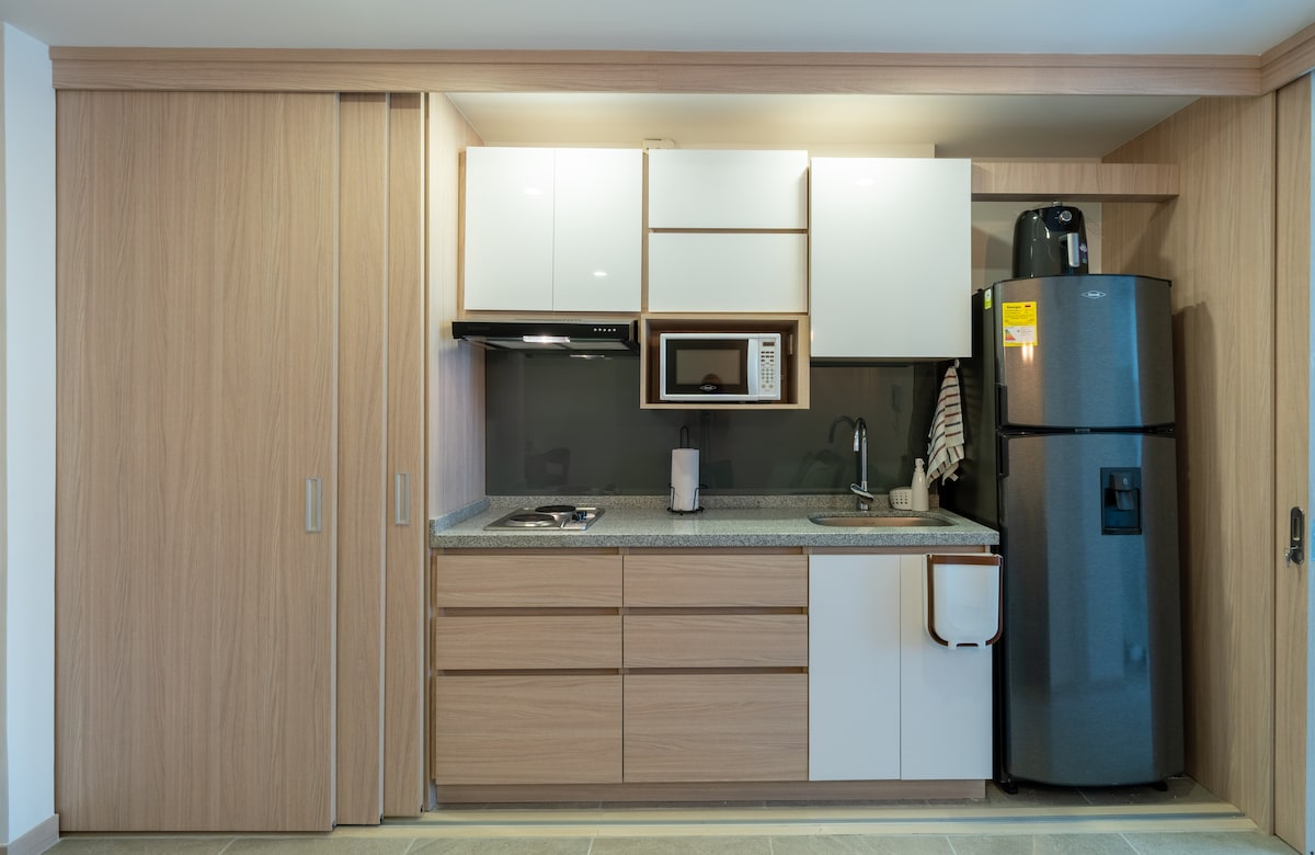 20 meters from the park, apartment with a single space equipped for 2 to 5 people Check-in 3 pm - Check-out 12 noon Self-Check-in with Smart Lock •2 Double beds •Living room with sofa bed. •1 full bathroom with hot water •Hairdryer. • Smart TV with cable and Netflix account. • Fan •Closet •Dining room • Equipped kitchen. • A coffee maker. •Coffee, water, and peanuts. * BREAKFAST NOT INCLUDED * WE DO NOT HAVE PARKING