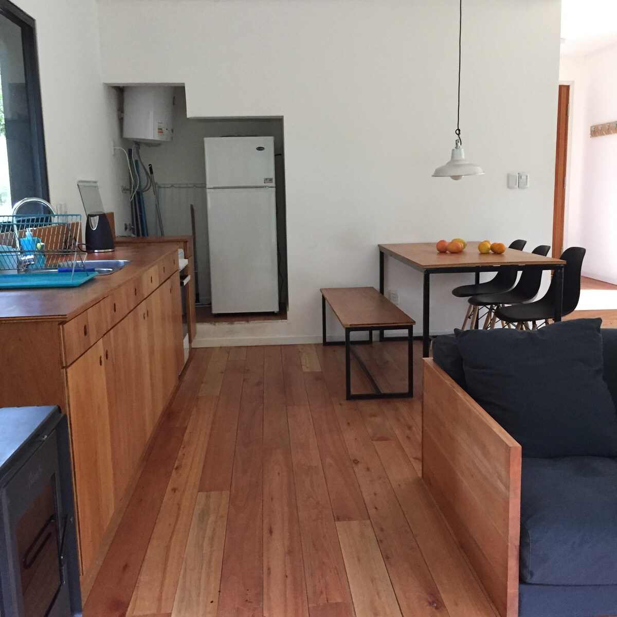 New house, 50 meters from the river. Surrounded by native trees, the house is built with warm designer materials, double glazed openings with mosquito nets, wood heater, cold/heat air, it has a large open living-kitchen space, 1 en-suite bedroom (double bed) with exit to the deck, 1 bedroom with bed with cart (2 twin beds) and 2nd bathroom. Fiber optic Wi-Fi. Grill for 6 with utensils. Deckchairs to take to the beach. Parking space. No separate electricity charge.