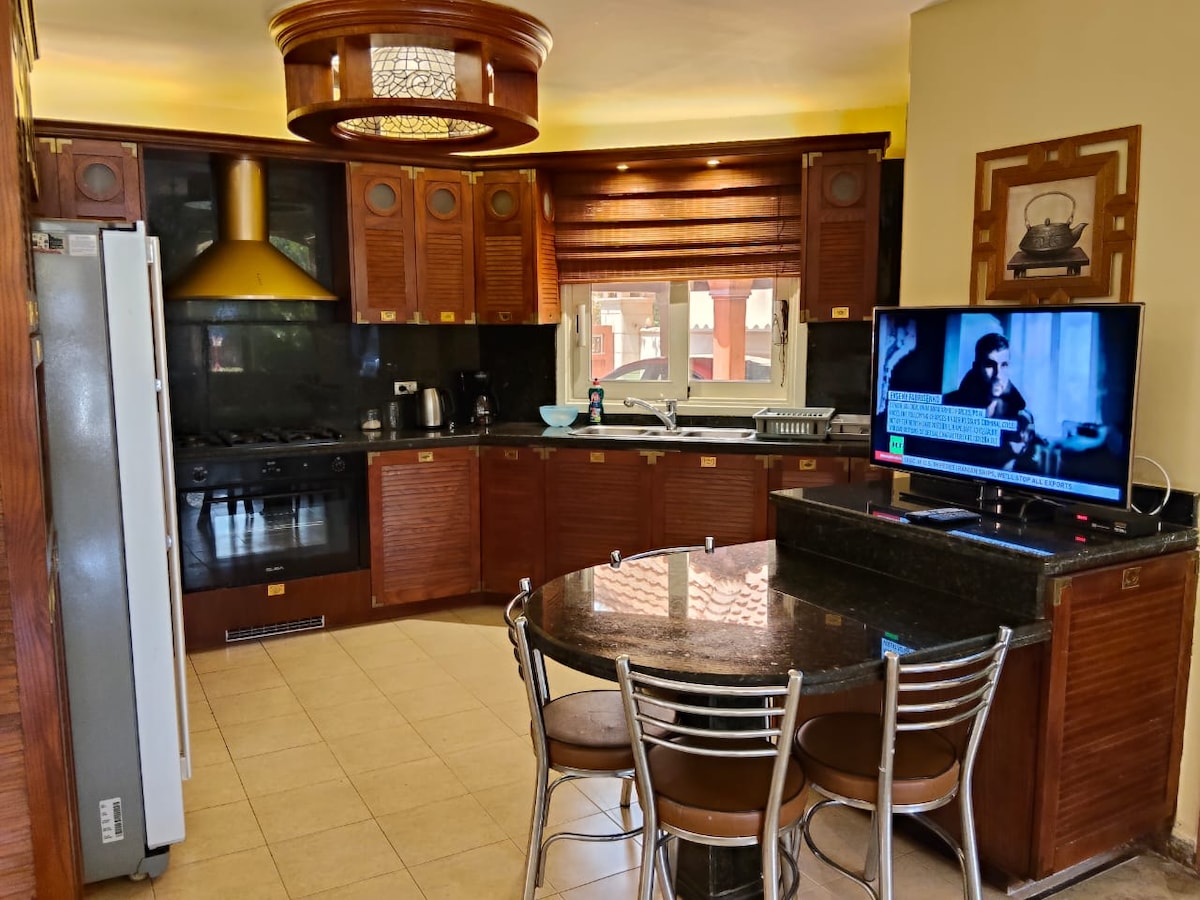 Relax with the whole family at this peaceful place to stay. It is 3 bedrooms first floor chalet. The chalet is fully air conditioned with amenities including a fully equiped open kitchen, smart TV, living area, balkony and a roof with dining area and BBQ, on spacious golf garden. The flat is walkable to adult pool and shaded kids pool. 4 minutes by car to Jazz hotel and large sandy beach.