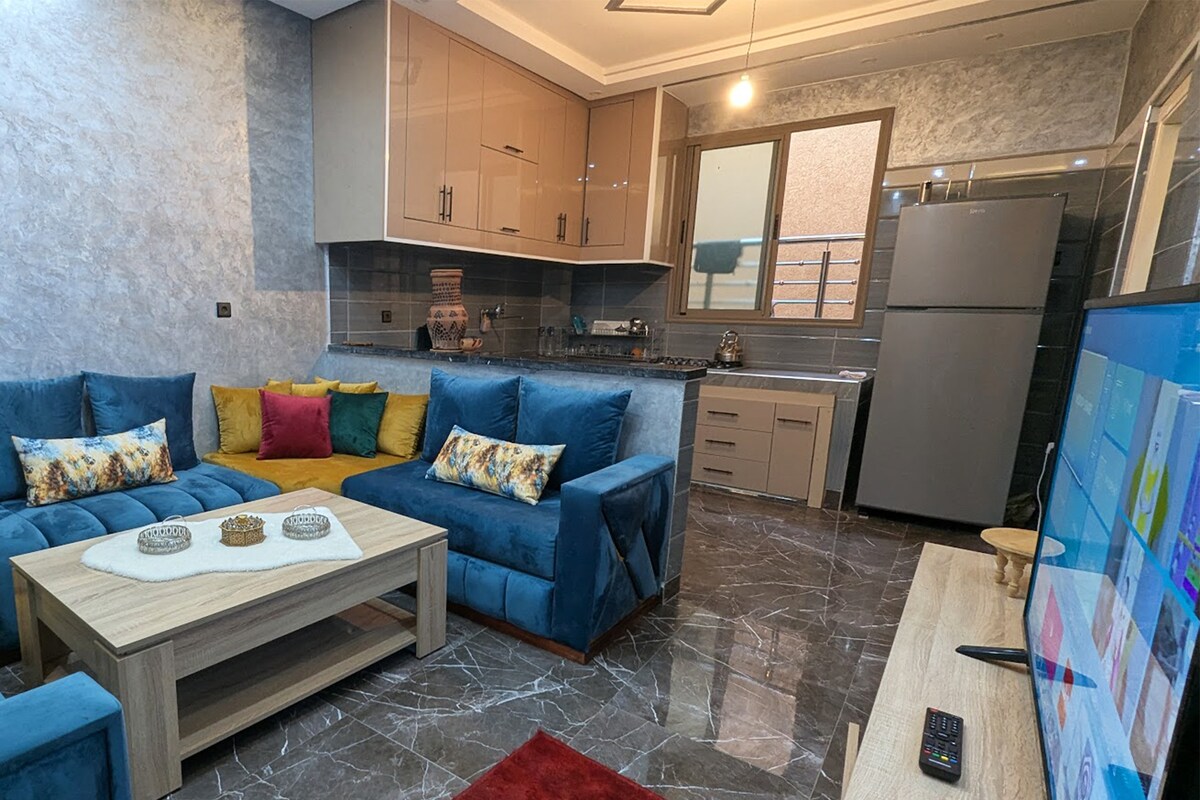 Attractive, furnished flat for daily rent. Kobol without a marriage contract is prohibited. Drugs and alcohol of all kinds are not permitted. Respect and calm behaviour are essential. Families, employees, investors, companies and the Moroccan community are welcome. It is important to take care of the flat's fixtures and fittings. For your information, I also live in the same building on the first floor. The flat available for daily rent is on the ground floor (rez-de-chaussée). It is comfortable and in excellent condition, cool in summer and warm in winter.
