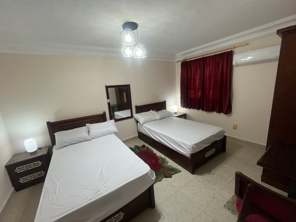 A spacious 200 sqm apartment in the heart of Al-Fustat, featuring 3 bedrooms with 6 beds, including a master bedroom with a private bathroom, plus a second bathroom serving the other rooms. It offers a large reception area made up of two spacious living rooms, along with 2 terraces. Located on the ground floor overlooking a garden, it provides a peaceful and comfortable stay.