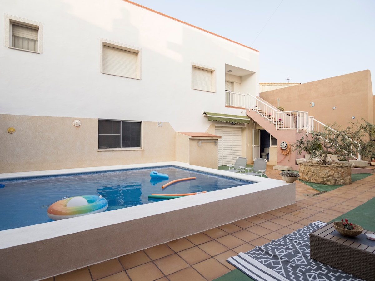 A country house with a private pool, located in the heart of the Ebro Delta. Spacious and bright, the house consists of a large living/dining room, a large and functional kitchen, two bathrooms with a shower, two bedrooms with a double bed and another with a double bed plus a single bed. The back of the house has a large private and enclosed patio, with a large terrace area, pool and porch with barbecue and table. Easy to park at street level and supermarket next door