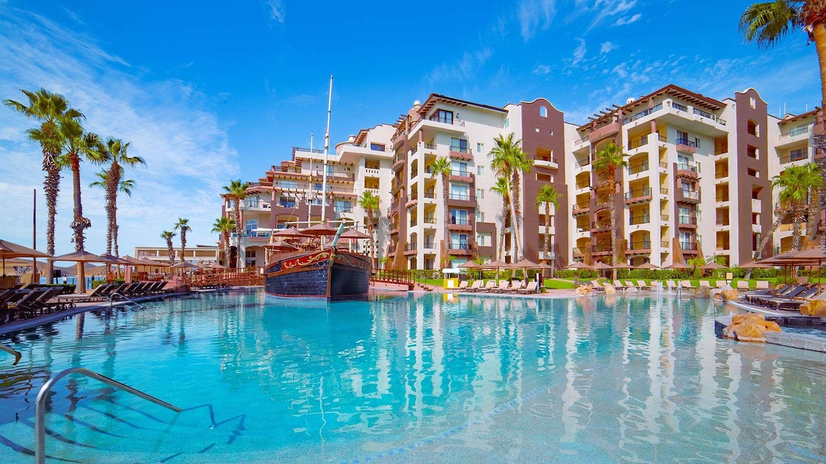 Get ready to book your luxurious 5-star vacation at this amazing studio with a kitchen and balcony. It has 2 double beds for 3 adults or 2 adults, 2 children under 12. This is a breathtaking, luxury beachfront resort with every amenity under the sun... and year-round sunshine! Beachfront access Wifi Room cleaning A/C Laundry services Free Parking Swimming pool Hot tub Gym Sauna Tennis Courts Entertainment Only be a short walk to nightlife, Cascadas Beach Grill, Cabo Sky Tours & The Marina!
