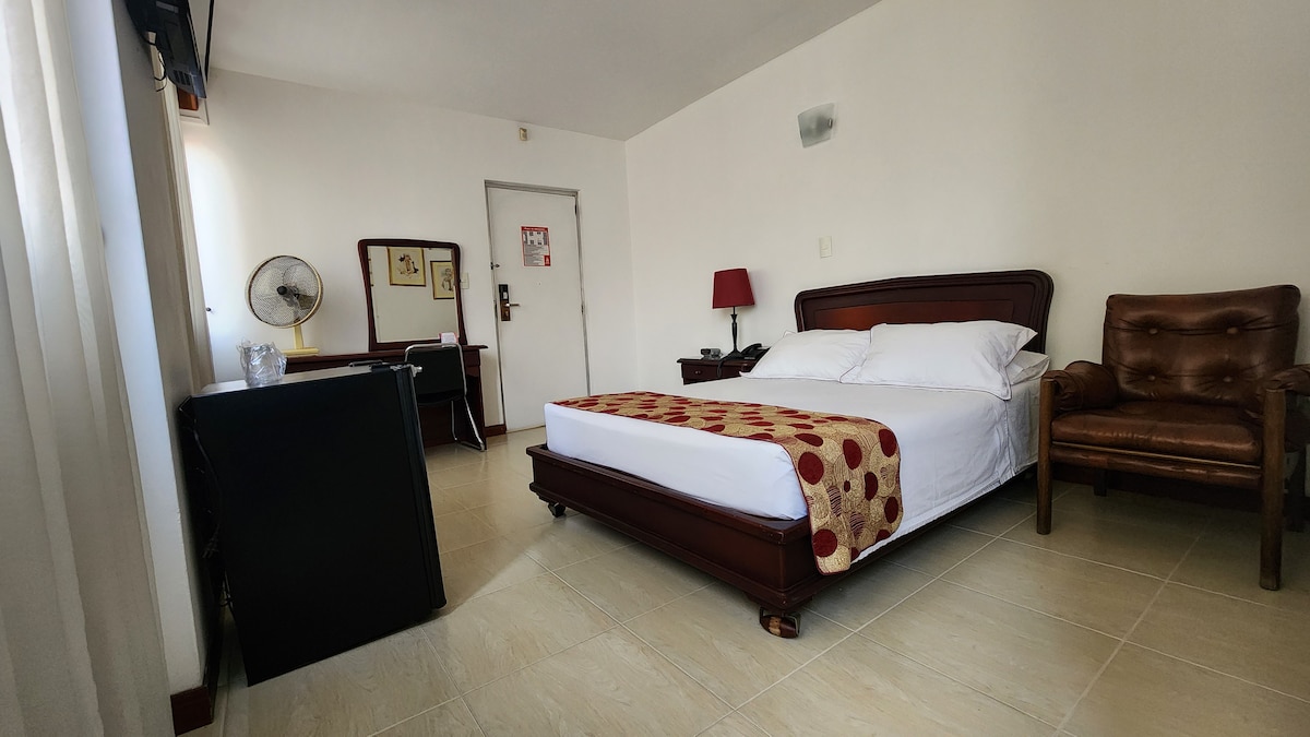Habitación de 29 Mt2 con 2 camas queen, para máximo 4 personas. Tiene aire acondicionado, secador de pelo, plancha, baño privado con ducha, pisos de madera, caja fuerte, wifi de cortesía y muchas más facilidades. Tiene un delicioso desayuno incluído el cual tomarás en el restaurante del hotel.