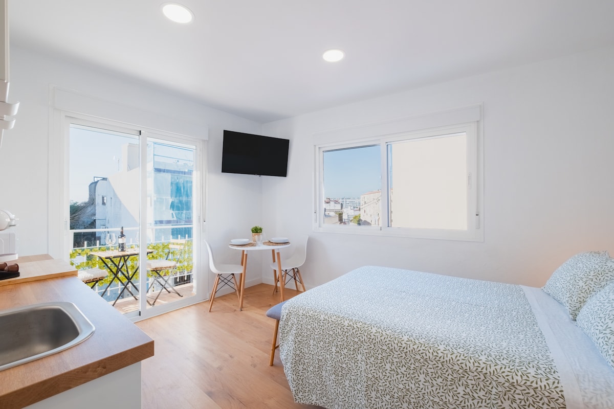 Disfruta de la sencillez y elegancia de este alojamiento tranquilo y céntrico. El apartamento ocupa parte de la planta baja de nuestra casa de huéspedes, tiene entrada directa desde el patio y disfruta de dos enormes ventanas, lo que lo hace muy luminoso todo el año. Se trata de un mini loft con una mini cocina, una zona de estar y dormitorio todo en uno. Dispone armarios, TV, baño privado, WIFI y por supuesto si lo deseas, puedes utilizar el patio de nuestra casa. No se hace limpieza diaria.