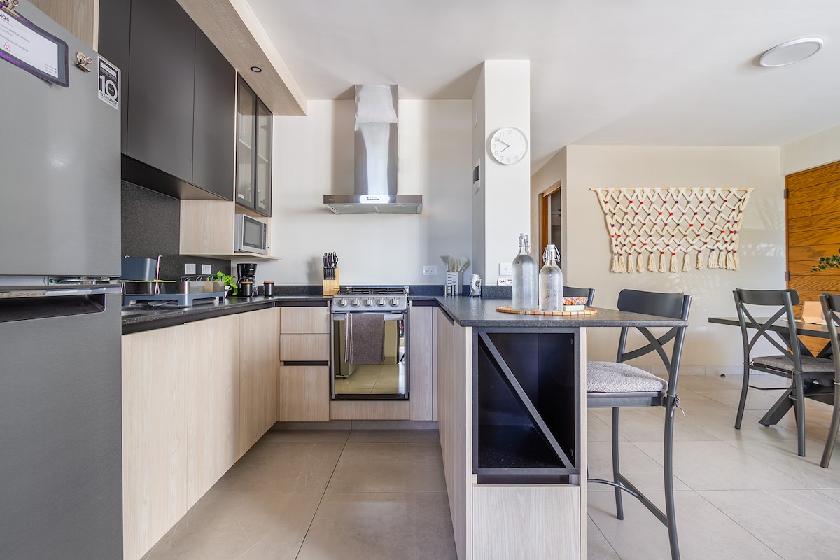 "LA GOTA" BUILDING between Plaza del Parque and Plaza Boulevares Private terrace, with table and 8 chairs High-speed WiFi SmartTV (Roku) in the living room and master bedroom Comfortable desk with contacts and USB port in case you need to work Kitchen with stove, microwave, refrigerator, blender, coffee maker, dishes, kitchen utensils and 5-stage water purifier Washer and dryer Entrance with digital locks, enter and exit when needed Pets are prohibited
