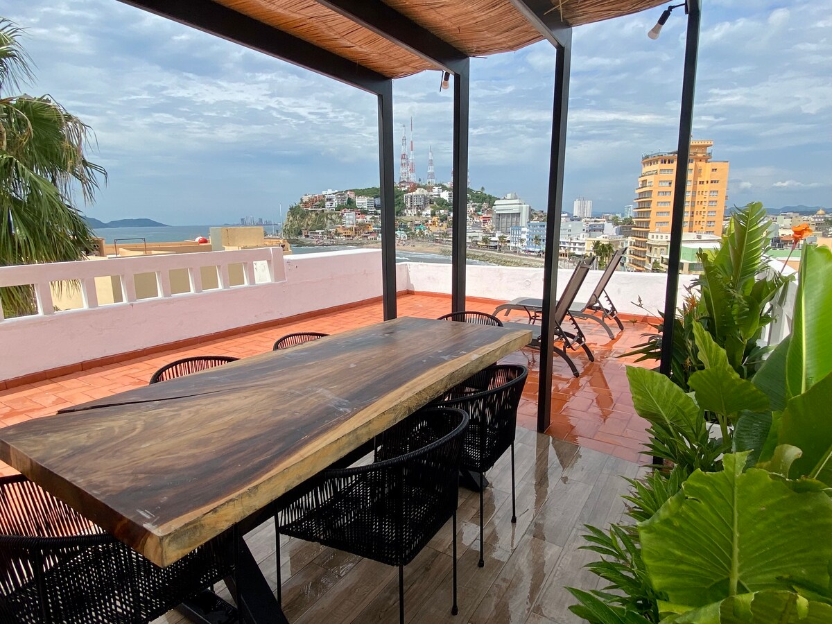 Ocean View in Cerro de la Nevería | Bikes & Beach Gear Included. Exclusive apartment with stunning 360° views of Olas Altas, the Historic Center, and the Lighthouse. Enjoy the rooftop with panoramic pool and unforgettable sunsets. Ride along the Malecón by bike and experience the beach with umbrella and chairs included. Prime location combining tranquility, proximity to top attractions, and the best way to discover Mazatlán from above.