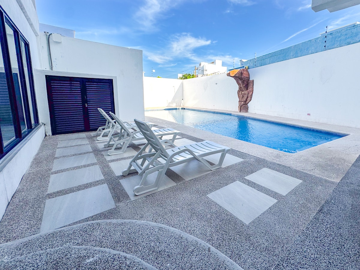 Visiting Mazatlán? Great! We have a superb place. Apartment 2 has what you need: ✔️ First-floor location 🔒 Inside a secure building, accessible by codes 🛏️ Queen bed for 2, max 4 if you rent an inflatable mattress ($300 MXN) 🚽Bathroom 🌬️ Minisplit (AC unit) 🥄 Equipped kitchen 📺 Smart TV 🚀 Internet Plus, there is a terrace with a pool, grill, and bar lounge available on the 3rd floor. 5 min. from the Golden Zone (Zona Dorada) and close to restaurants, Soriana, and Walmart.