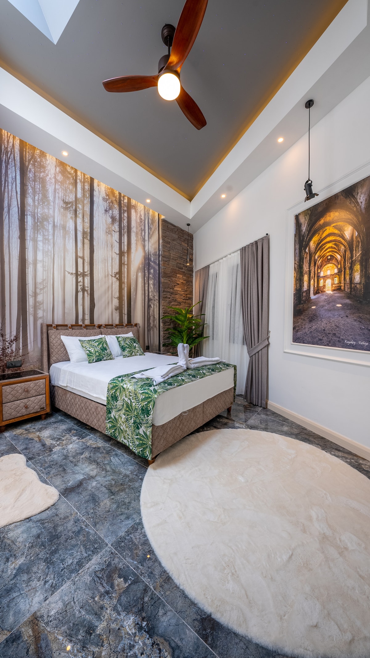 Our villa is a luxurious, fully equipped villa located in the city center, with easy access to everywhere, surrounded by nature. Our villa has two bedrooms, a children's room, dressing room, two bathrooms, a shared toilet, laundry room, kitchen, living room, a botanical garden inside the house, a barbecue and dining area outside the house, and a 50 sqm pool. Our villa is 1 km from the coast, 3 km from the nearest beach and 2 km from the city center.