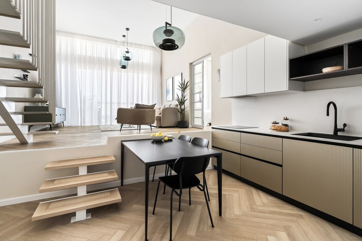Welcome to our stunning renovated penthouse nestled in the heart of TLV, mere moments from the shimmering beach. Occupying the top floor of a meticulously preserved Bauhaus building, this apartment offers an unbeatable blend of historic charm and modern. a world of sophisticated elegance as soon as you open the door. The highend interior design of this penthouse pays homage to the Bauhaus style,The spacious, open layout creates an inviting atmosphere, perfect for relaxation or entertainment