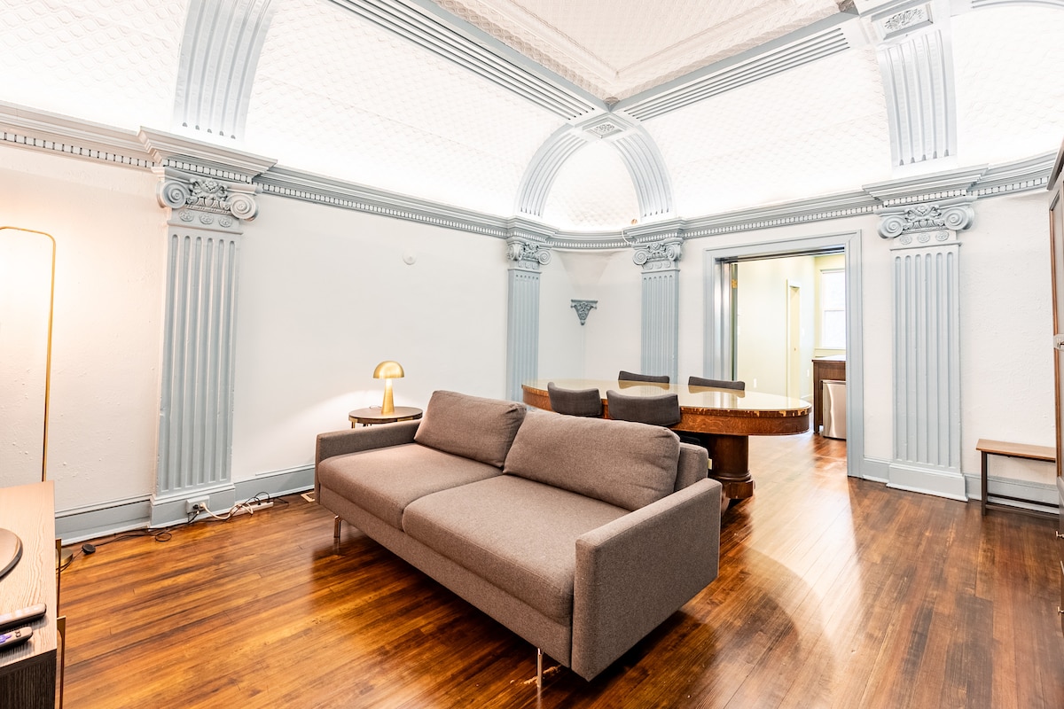 A spectacular marble columned facade of the former Polish Bank invites you to enter this apartment designed with mid century modern furniture . The 800 square foot 2nd floor apartment features original vaulted ceilings and columned walls from the 1800s and many of the original features from its former life as a bank, all the while blending modern furniture to create a hip vintage vibe.