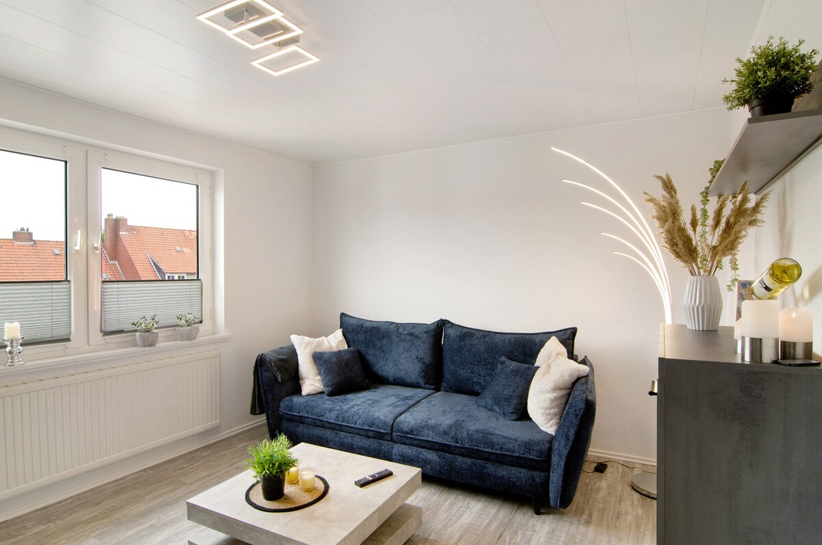 Eine stilvolle Wohnung in bester Lage – frisch renoviert in 2025. Direkt im Stadtzentrum gelegen, bietet sie einen Blick auf den Delft und das Feuerschiff in Emden. Dank der zentralen Lage ist alles bequem zu Fuß erreichbar– das Rathaus liegt nur 150 Meter entfernt. Im Wohnzimmer sorgt ein 85-Zoll-TV für Entertainment. Die voll ausgestattete Küche lädt zum Kochen ein, und Tee sowie Kaffee stehen jederzeit bereit. Mit Self-Check-in und Türcode gibt es volle Flexibilität – ohne Schlüsselübergabe.