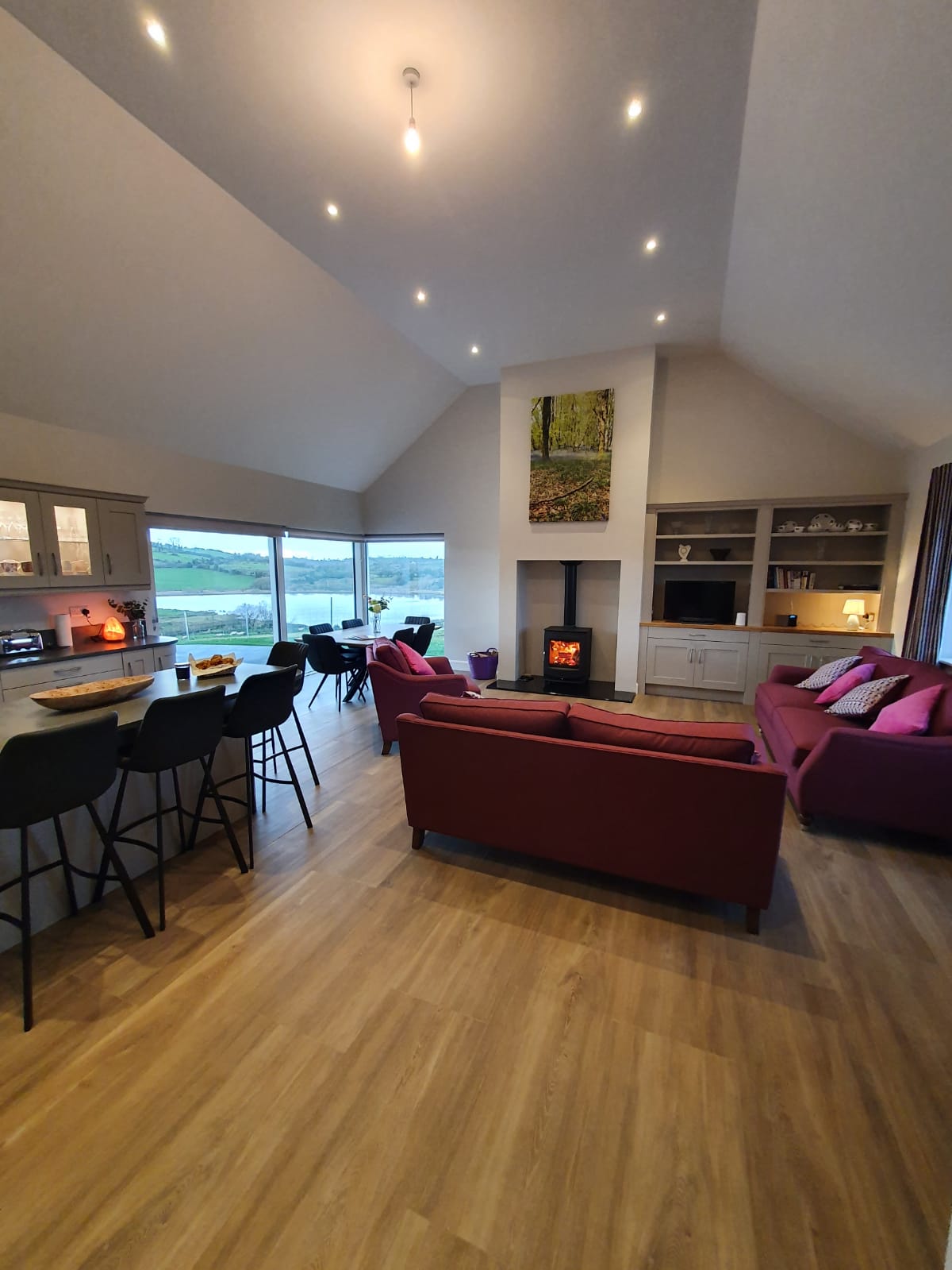This modern, luxurious cottage is truly special. It is located in the Tawnawully mountains by Lough Eske. It is set on 12 acres with a river running through it and a tumbling waterfall right by the cottage. Only 15 minutes drive to Donegal town, which has some really nice restaurants and bars. There is a castle to explore in the town and a wonderful craft village with a very good cafe. Ten minutes drive to Harveys Point and twelve minutes from Lough Eske castle, both reputable 5 * hotels.