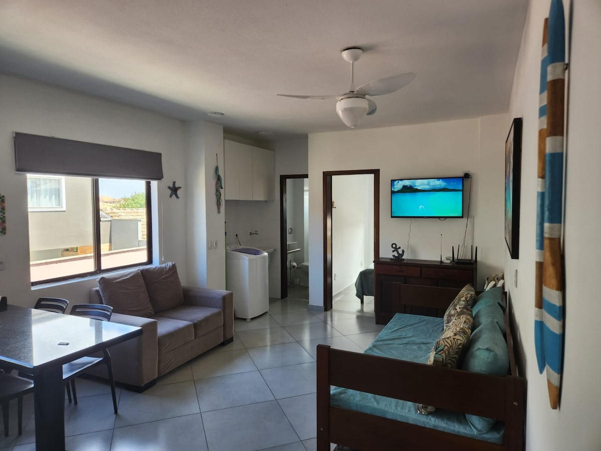 O apartamento no terceiro andar (ultimo) possui todos os móveis e cozinha planejada para você e sua família. O espaço possui ar condicionado nos dois quartos. TV com ChromeCast/Smart Além disso, o prédio conta com área comum com deck de madeira, chuveiros e banheiros externos, além de garagem para 1 carro. O condomínio é equipado com poço artesiano, garantindo que não faltará água, até mesmo na alta temporada. A menos de 1minuto da Prainha. Verificar datas para temporada