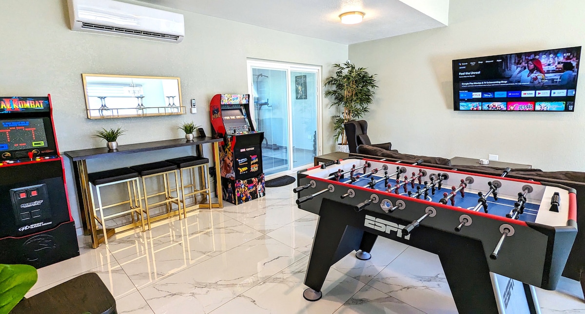 Experience luxury in Mexico's wine country! Our stunning 5-bed/4-bath modern home offers the perfect blend of comfort and entertainment. Enjoy fast Wi-Fi, 8 smart TVs with Netflix & Disney+, a gym, and Alexa speaker. Relax in the heated Jacuzzi or have fun with the arcade, foosball, and putting green. Outdoor enthusiasts will love the gas grill and fire pit. Climate-controlled interiors ensure year-round comfort. Secure parking for 4 cars. Conveniently located near markets and amenities.