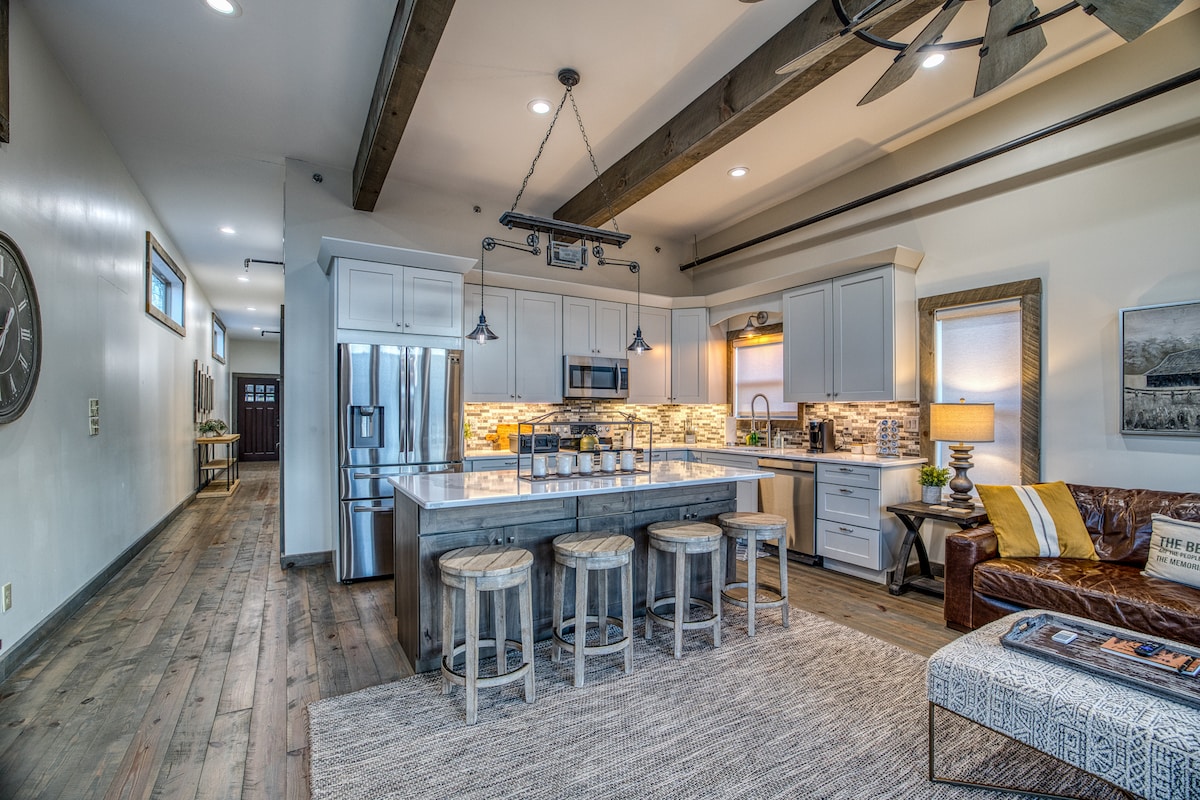 Come stay at the iconic Blue Ridge Mural Building, located just one block from Main Street! This downtown treasure has been reimagined into a one-of-a kind destination experience...a true in-town oasis! Enjoy the best of both worlds-a spacious, newly renovated downtown property that offers a large patio with a hot tub, grill, and yes - a beautiful sauna! Walk to everything! If steep, winding mountain roads aren't your favorite but you still want all the amenities, this is the place for you!