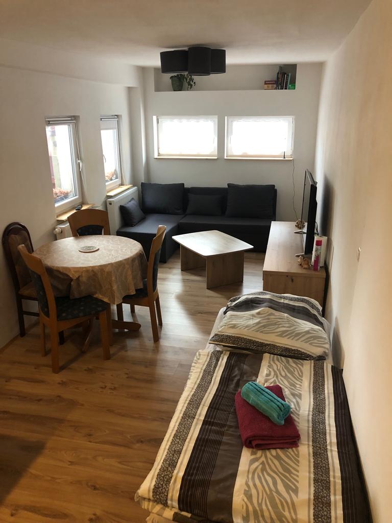Ruhige Unterkunft am ruhigen Dorfrand Willkommen beim uns im gemütlichen 15 m² Studio ! Es bietet eine Schlafcouch, Schreibtisch, TV, kleine Küche, Dusche/WC und kostenfreies WLAN. Die Lage am Dorfrand und der Seeblick vom Grundstück aus, sorgen für absolute Entspannung. Genießen Sie die gemeinschaftlich nutzbare Terrasse und Feuerstelle. Noch mit kleinen Mängeln, aber bereits sehr komfortabel. Perfekt für Naturliebhaber, Montage-Arbeiter, Alleinreisende und Ruhesuchende! Auch prima mit Kind.