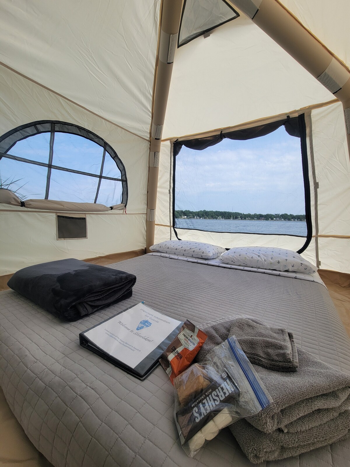 Lake Tent #1 at The Silverlaken Estate rests on the shore of Silver Lake, minutes from Letchworth State Park and the village of Perry NY. It features a queen bed with a short walk to the restrooms, shower and kitchen facilities for our tent guests. This unique accommodation provides breathtaking views of Silver Lake. Each lake tent has a rain tarp to protect you from bad weather. We provide bedding, bath towels, and toiletries for our lake tents guests.