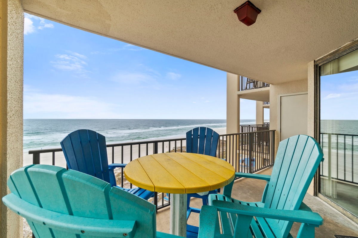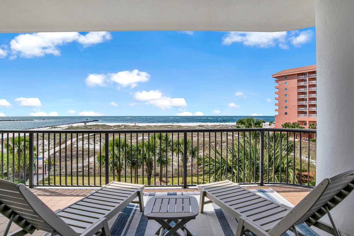 ASK about DISCOUNT rate for monthly stay in January and February 2026. DON'T FIGHT THE CROWDS for space on the beach! Unwind in our comfortable 4th floor Beach Front "Slice of Paradise" with private beach. The balcony offers unobstructed, gorgeous views of the Gulf and the beautiful white sands of Perdido Key. Soak up the sun as you kick back on the balcony and count the dolphins while being lulled by the sound of the waves and the salt air breeze. Recently UPDATED-New photos coming soon!