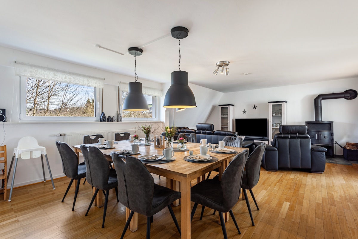 ❄️ Your warm retreat in Sauerland Marina Loft Eslohe offers 100 m² of modern design, underfloor heating in all rooms (pleasant barefoot 👣) and a bathtub to warm up after days of skiing. Ideal for families, couples & friends – with three double beds, fully equipped kitchen, smart TV & fast Wi-Fi. Perfect for winter hikes, ski trips & cozy movie nights.
