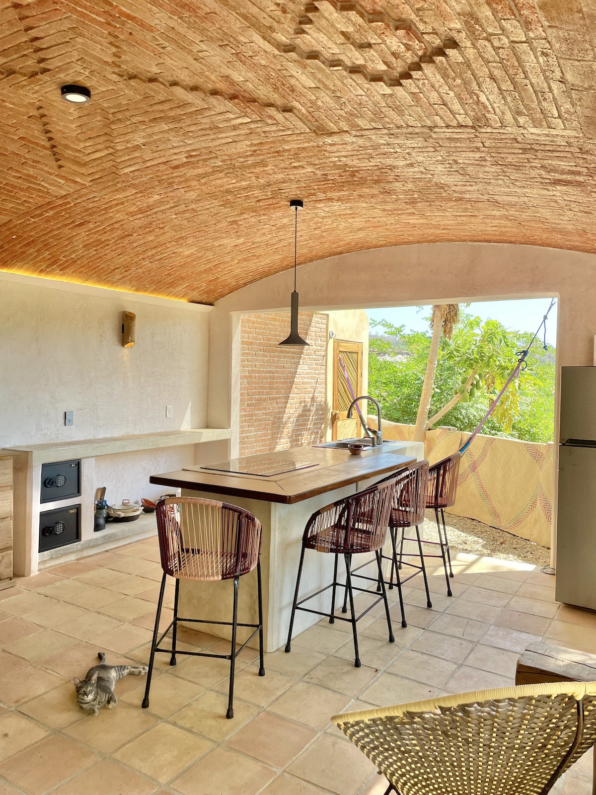 Designer Oaxacan vacation home nestled in nature, with forever views of an unspoiled coastline. Designed for maximum relaxation and pleasure, with living spaces on both levels; a large, chef's kitchen, 3 screened-in bedrooms (2 w/AC), 3 baths, outdoor shower, hot water, laundry, and a private swimming beach with epic marine life. With NO INTERNET! Intentionally. Which is the biggest luxury of all. This is more than a home. It's a private sanctuary, and getaway for your mind.