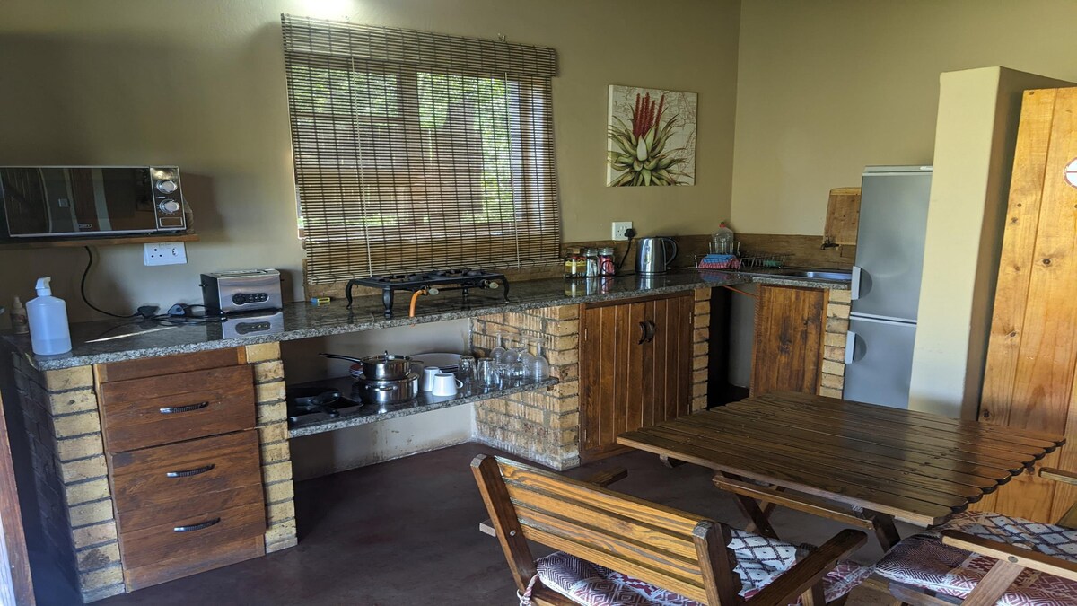 Nyala Cottage has an en-suite bathroom, kitchenette, balcony, and braai place. The shared communal area has a beautiful large swimming pool and lounge area. Starlink Wifi available. There are a number of little private decks along the river to sit and enjoy nature.