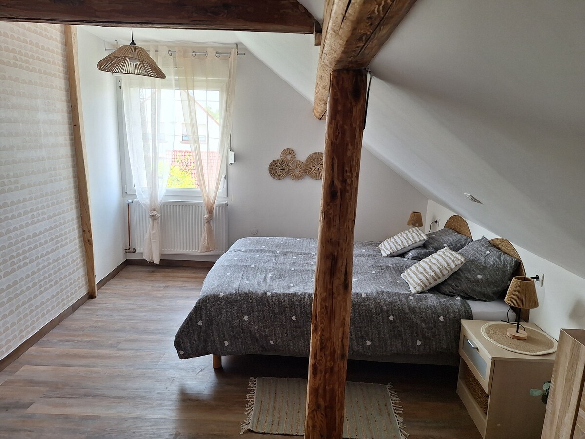 Entire adjoining accommodation on 2 levels. Rated 3 stars by Clé Vacances. This modern, bright and cocooning cottage of 45 m2 (38 m2 accommodation and 7 m2 terrace/balcony) at the foot of the Vosges du Nord Natural Park in Alsace Bossue awaits you for a beautiful quiet stay in the heart of nature. Located 5 minutes from Wingen sur Moder train station (45 minutes from Strasbourg by train).