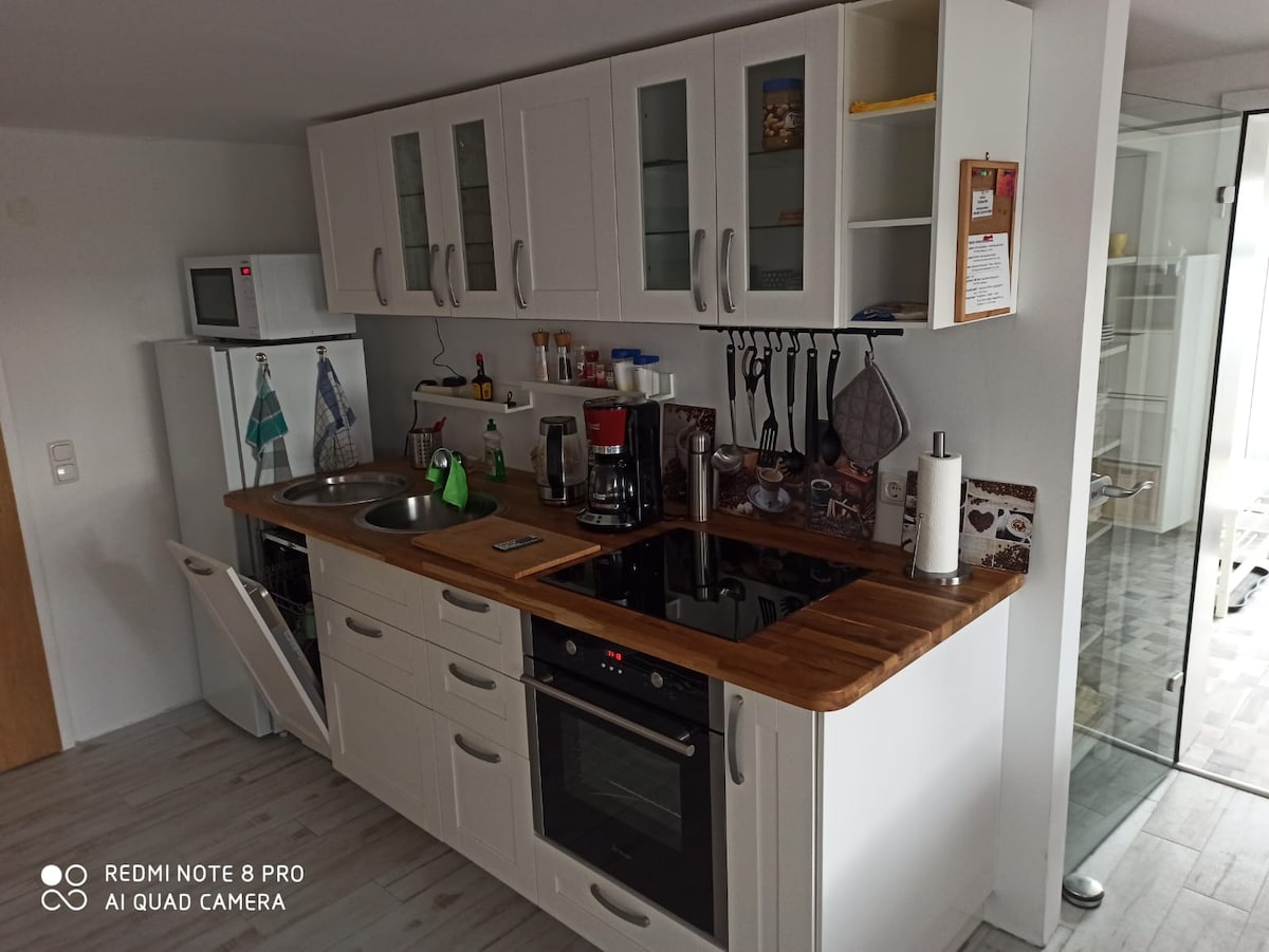 Welcome to our newly renovated apartment. Here you will find three lovingly furnished, modern, lockable rooms with two double beds (2 m, 1.4 m) and a sofa bed for two people. Two bathrooms including a washing machine and the kitchen make the apartment a place of relaxation for up to 6 guests. Fresh baked goods are available Monday through Saturday by pre-order. Whether as a vacation apartment for the family, the weekend trip for the couple or as a fitter's apartment: we look forward to seeing you soon!