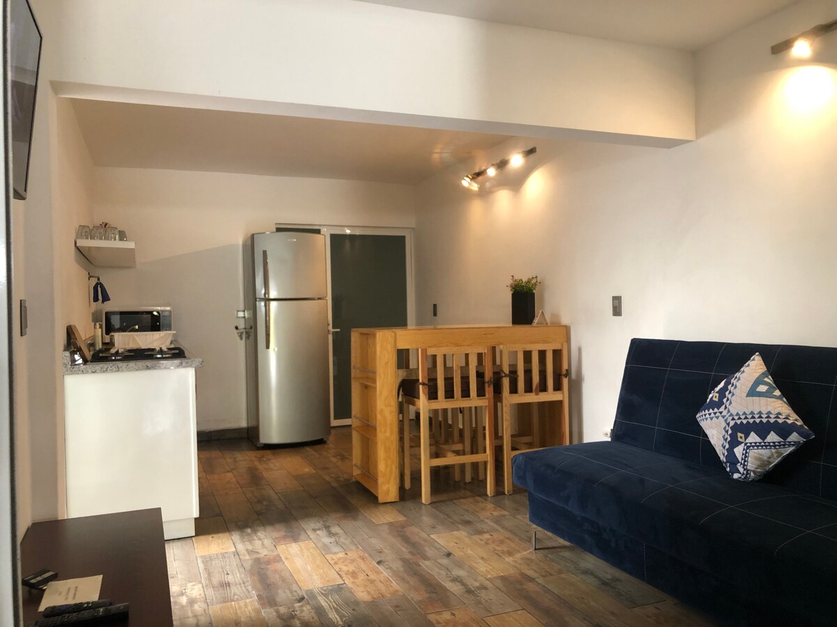 Independent and cozy loft, great location. King bed, cable TV, and magnetic induction stove. A few blocks from Victoria and Deportivo IV Centenario stadiums. Close to the railway complex where the Museum of Contemporary Art, Hospital Hidalgo, Grupo Modelo offices, Telethon and Tres Centurias Railway Complex are located. South/North of the city in 15 minutes and Downtown in 7 minutes. 10 minutes from the Poliforum Charro. Enjoy what Ags has to offer; make yourself at home during your visit.