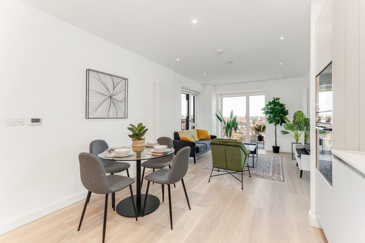 A bright, modern 1-bed apartment close to ExCel, Canning Town & O2. Comes with a spacious lounge, sleek kitchen and 2 contemporary bathrooms. Enjoy fast WiFi, comfortable bedding and a calm, minimalist space perfect for couples, professionals and travellers. Excellent transport links nearby for easy access to the city. 5 mins walk to DLR station and 10 min walk to Elizabeth Line station Easy access to Central London- 5mins to Canary Wharf 20 mins to Tottenham Court Road/Oxford Street via train