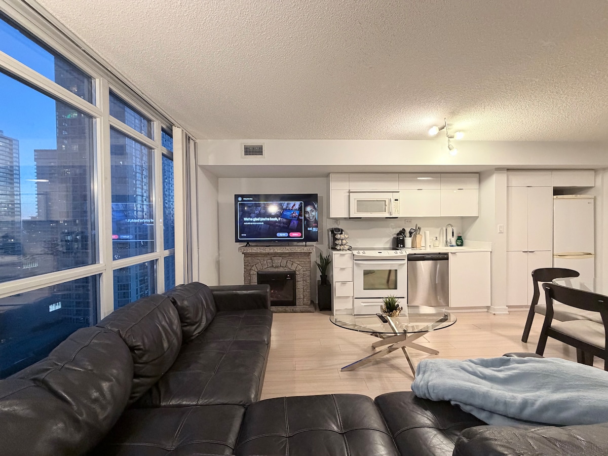 Welcome to the Lil Fort! This cozy 1-bedroom condo offers an open concept living/dining area, and a secondary entrance via your private patio . Just steps from Fort York Park, the lakefront, and downtown dining/entertainment. Enjoy a comfy queen bed, 65” 4K TV, full kitchen, and relaxing bathroom. Skip the elevator—stay on the main floor and unwind in style! Keep it simple at this peaceful and centrally located place. Walking distance to entertainment district, shopping. Parks, and more!