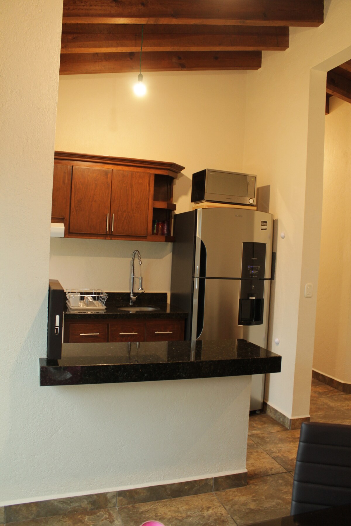 We decided to paint our little house "El Maguey" pink, to highlight the joy and Mexican folklore. It is a little house that has a bedroom and bathroom on the ground floor, for people who do not like to climb steps, a hall with a fireplace and a view of the rock, a small Mexican kitchen and on the top floor 1 full bathroom with separate entrance for each room, where the main one has a small terrace, with an excellent view of the third largest monolith in the world.