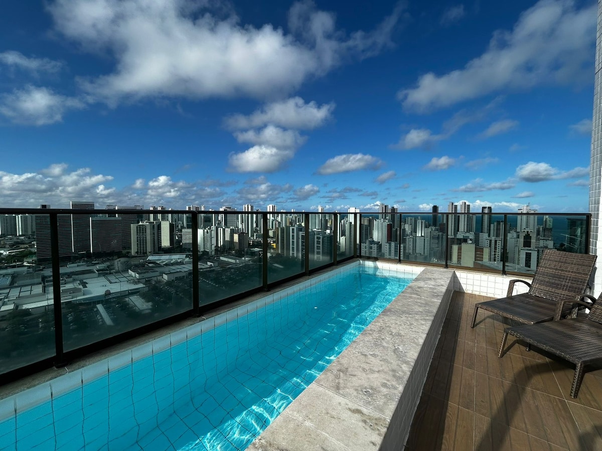 Cosy studio in Boa Viagem with a beautiful sea view and a great location: - A 12-minute walk from the best part of Boa Viagem Beach; - 15 minutes from the airport; - 8 minutes from Shopping Recife; - Close to a market, bakery, restaurants and bars. Next to Via Mangue, which is one of the main access roads to Recife Antigo and Olinda. The building has 24h concierge, Mini Mercado, smart laundry and rooftop pool with beautiful views. We have a parking space.