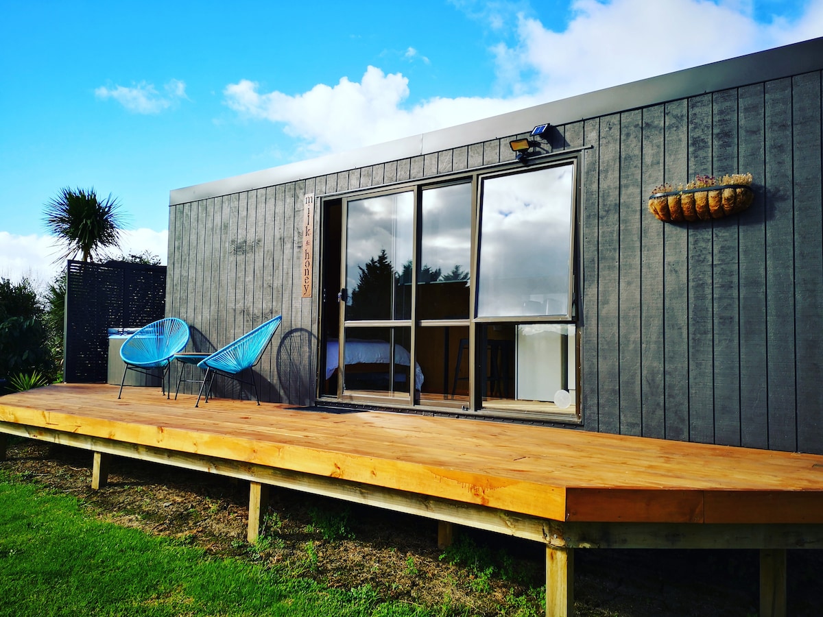 Welcome to Milk & Honey Luxe Cabin, our 20ft shipping container which has been converted into a fresh and modern glamping rural retreat. Enjoy complete privacy on your own deck and relax under the stars in the outdoor spa whilst looking out to rolling hills and lush surroundings.