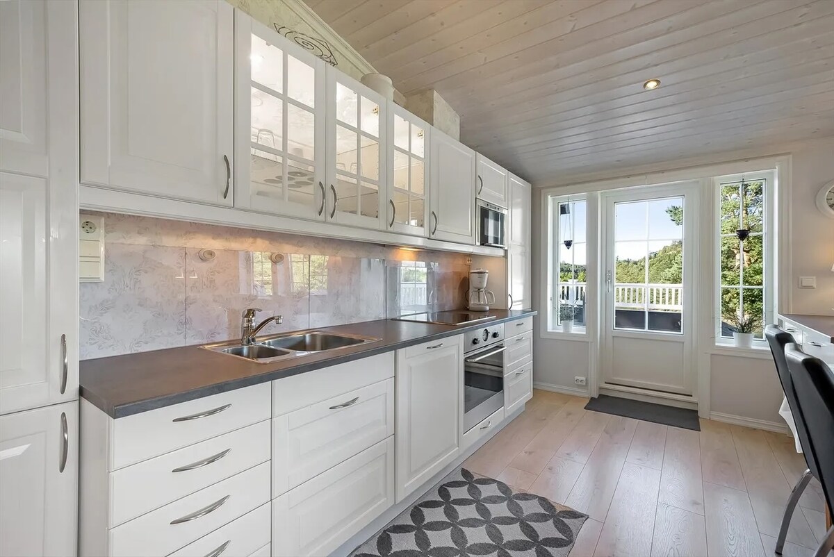 Modern functionalist home with panoramic views of Farsundskjærgården and the entrance. Welcome to a unique holiday experience in our stylish functionalist home in Farsund! This beautiful home is located high and free, and offers stunning views of the sea and the beautiful scenery around. Perfect for families, couples and groups who want a quiet and comfortable base to explore Southern Norway. Walking distance to beaches, downtown shops and shopping mall.