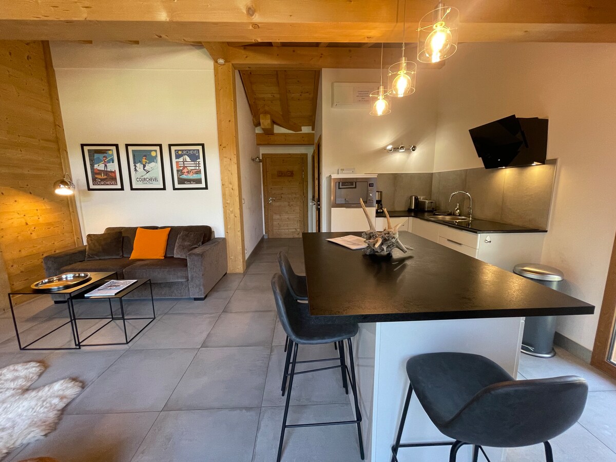 Exceptional studio at the foot of the slopes – Courchevel 1550 Ideally located facing the snow front, this renovated studio offers ski-in/ski-out access in the popular Lou Rei residence. A short walk from shops, restaurants and ski lifts, it has a secure covered parking lot. In winter, the Grangettes cable car takes you to Courchevel 1850 in less than 5 minutes (8 a.m. - 11 p.m.). Enjoy a refined setting, combining comfort, elegance and practicality, with stunning views of the mountains. ☀️🏔️❄️